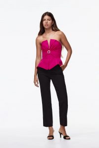 Un top color rosa fucsia con unos pantalones de talle color negro.
