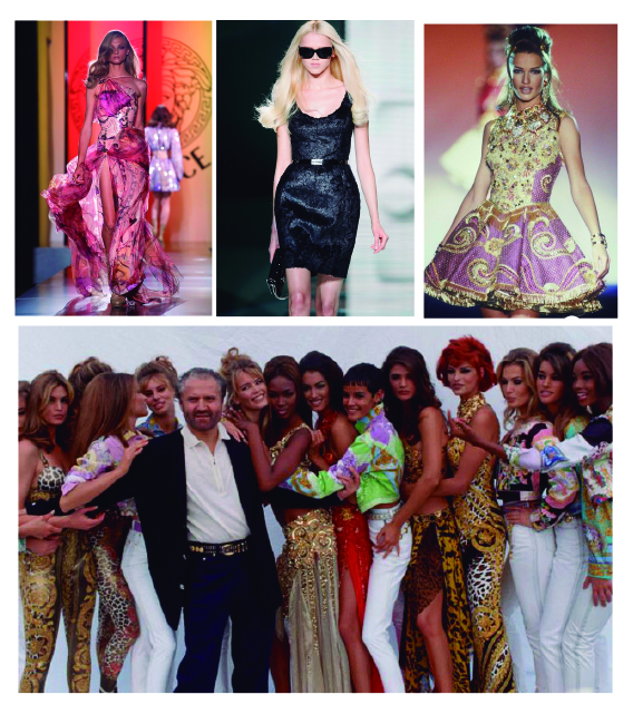 Todas ellas (Claudia Schiffer, Christy Turlington, Linda Evangelista, Cindy Crawford, Naomi Campbell, Carla Bruni y Helena Christensen) son creaciones de Gianni Versace.