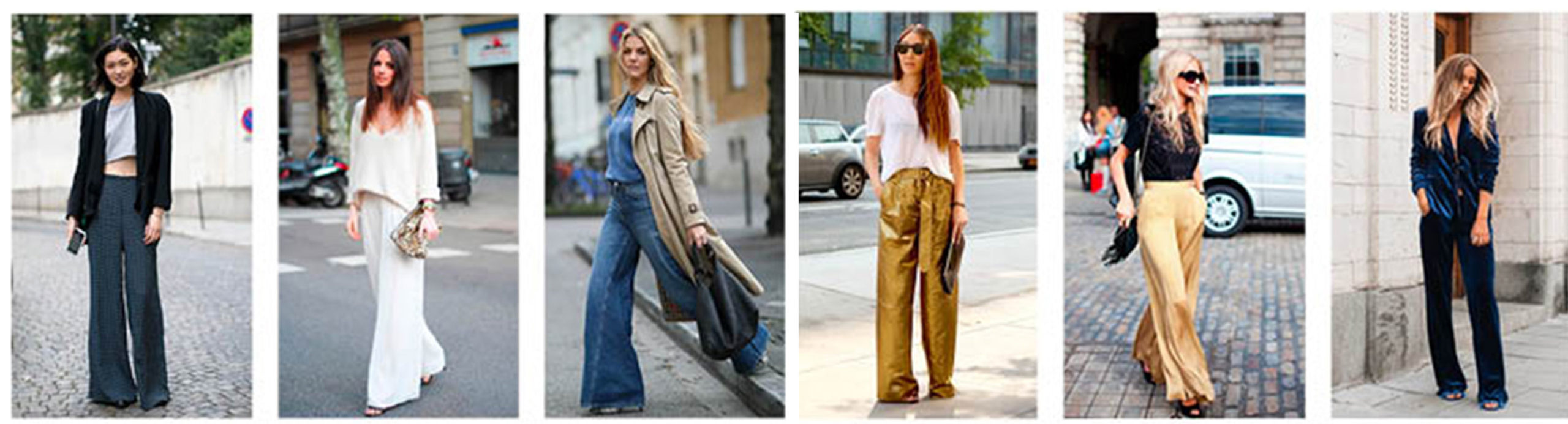 A continuación os añadimos fotos de diferentes looks con los que puedas combinar el pantalón palazzo, ya sea con la forma básica con la que se efectúa el patrón o incorporando nuevos elementos, como lazadas o bolsillos, con los que darás un toque especial a tu pantalón.