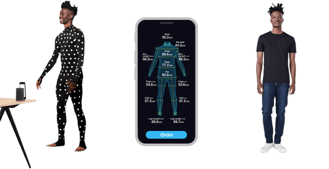 Se trata de un traje que permite pedir vestuario online de la talla exacta. Este traje se envía gratuitamente a los clientes, tiene más de 350 puntos blancos que funcionan como puntos de referencia que permiten recoger las medidas exactas de cada persona a través de una app instalada en los smartphone