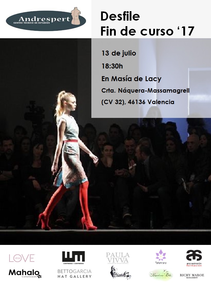 Un año más el desfile de moda organizado por la escuela de diseño y moda Andrespert se sitúa en el calendario como una de las citas más esperadas en el sector. El evento tendrá lugar el próximo 13 de julio a las 18.30h en la Masía de Lacy (Náquera), y como cada año en él se presentarán los trabajos realizados por los alumnos de la escuela.