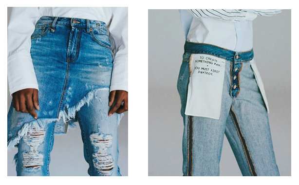 Las influencias de los 90 prevalecen, los rotos, tachas y decoraciones se amplían y mezclan en prendas muy elaboradas que suben en cintura y ensanchan en perneras.