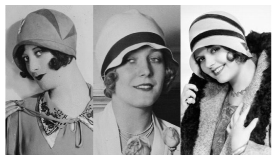 El Cloche: Nació tras la Primera Guerra Mundial, con el inicio de una época feliz y tranquila, llegó en el momento en el que el gusto por el lujo y la moda se hizo excesivo a nuevos adinerados y gente del mundo del arte y el espectáculo. El sombrero Cloche aportaba comodidad, movilidad y modernidad, pero al estar tan pegado a la cabeza y cerca de la cara, obligaba a tener un nuevo corte de pelo, más sencillo y masculino. Resaltan los ojos entornados, se marca mucho el maquillaje, los labios rojos y el rubor. Los tejidos que se usaban era normalmente en fieltro, a veces paga, terciopelo o seda, se adornaban de pequeñas joyas, velos o apliques varios.