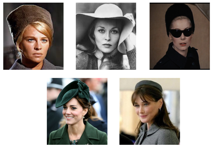 A lo largo de la historia, las mujeres que han sabido llevarlo como Julie Christie con sombrero de piel cilíndrico de influencia rusa en la película Doctor Zhivago. Al lado, una joven Fay Dunaway con sombrero floppy de los 70, pamela flexible y con caída. Catherine Deneuve en Belle de Jour vestida por Saint Laurent en estricto negro y con sombrero tipo pill-box. Las mujeres de hoy en día como Katherine Middleton, la Duquesa de Cambridge, utiliza los tocados con asiduidad. Carla Bruni Sarkozy, con pill-box de Dior y look que recuerda a Jackie.