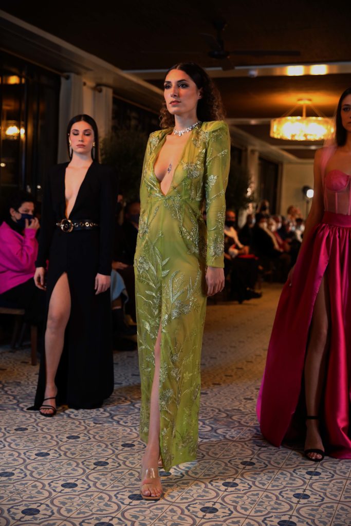 Oumi de la firma Oumaima El Jabouki mostró una colección de vestidos largos espectacular inspirados en el pez betta y cargados de fuerza y color.