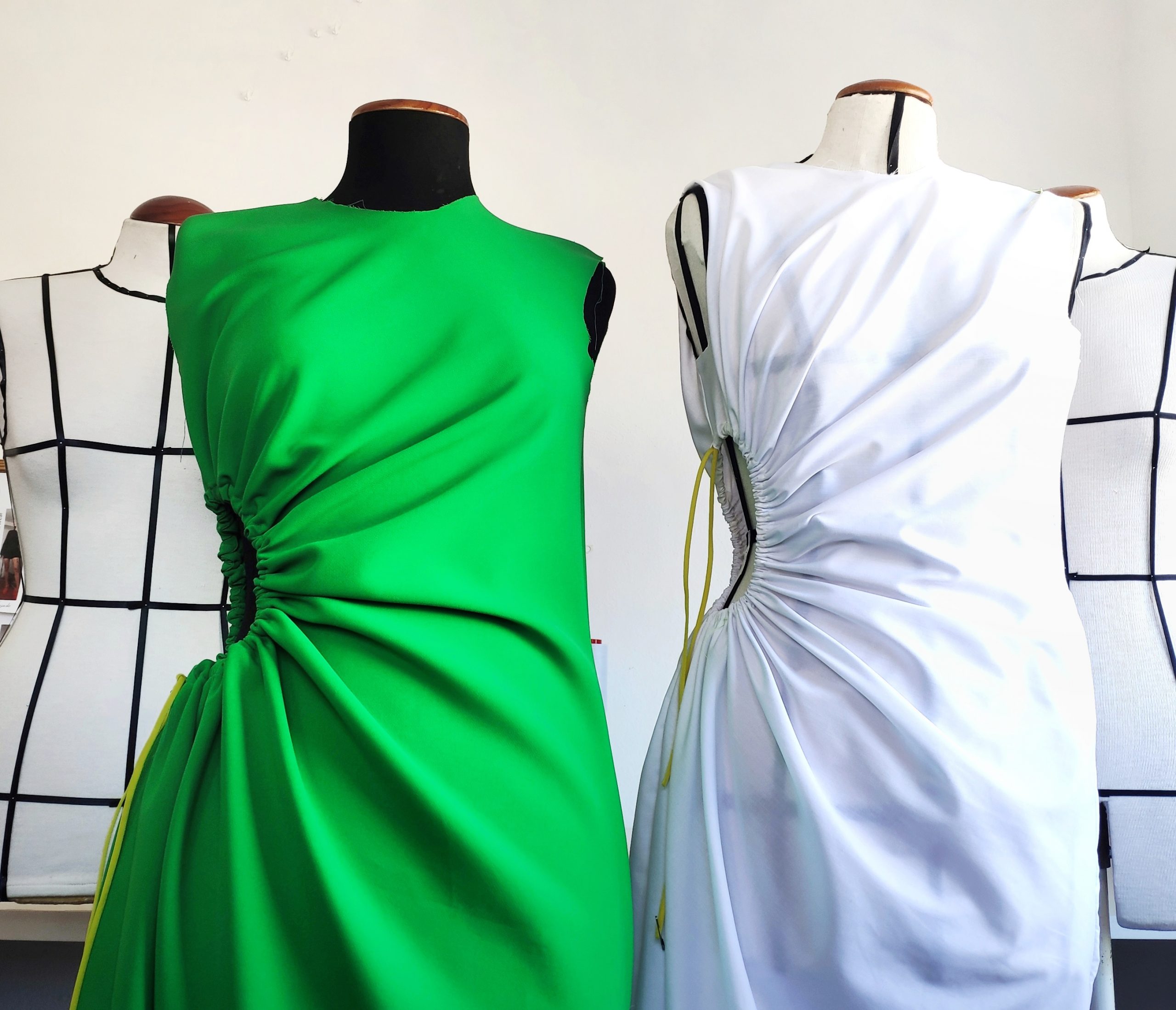 Por último, os vamos a explicar la técnica del entrelazado, en esta se drapea el tejido y lo modelamos como si estuviese entretejido. Se puede utilizar varios tejidos, en este caso se apreciarían con mayor claridad utilizando diferentes colores. Esta técnica se suelen ver en prendas de cuerpos. No hay que confundirlo con la técnica del brote de bambú (takenoko), que se realiza a partir de una sola pieza de tejido creando capas similares al escote estratificado de un kimono formal y cuya apariencia las asemeja a las capas de un brote de bambú. Cuando más ligera y ajustada sea la silueta del top, mayor realce tendrán los matices del tejido.